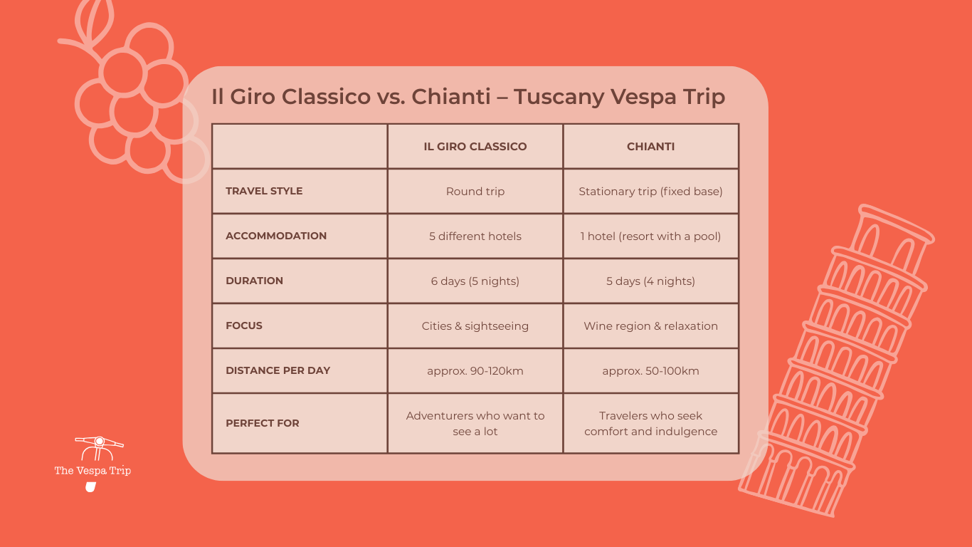 Comparez nos deux voyages en Vespa en Toscane en un coup d’œil. Ce visuel met en avant les principales différences entre Il Giro Classico et Chianti, pour vous aider à choisir l’itinéraire qui correspond le mieux à votre style, vos envies et votre rythme.